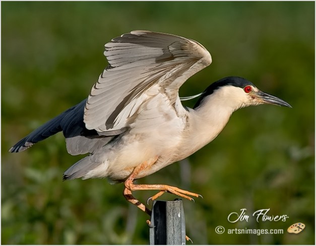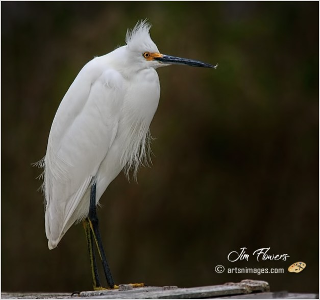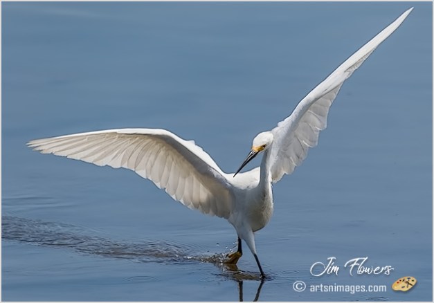 f the Egrets, the Snowy is quite the “showoff”, especially while herding his prey or staking out territory. Rapidly prancing through the shallow tidal flats, wings spread is a common and comical sight. It’s “snow white” feathers, black legs and yellow feet create quite the visual spectacle adding to his clownish behavior.