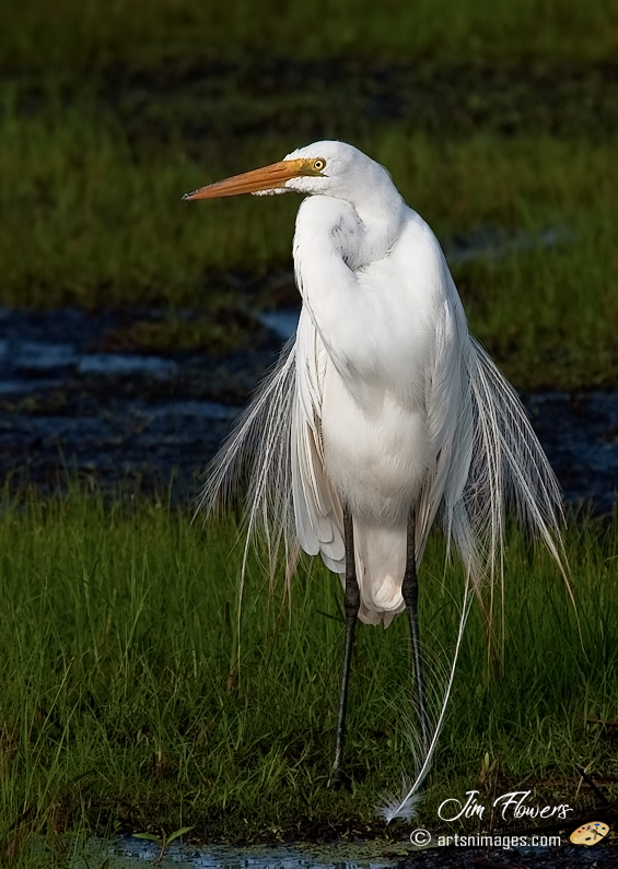 raceful Elegance fully describes this largest member of the Egret family in all of its snow-white splendor. Not as comical and aggressive as the Snowy Egret, but deliberate yet cautious while feeding and considerably slower and precise in movements. It hosts a lovely breeding plumage with the glowing green lore before the eye. A photographic challenge for exposure, but worth the extra effort.